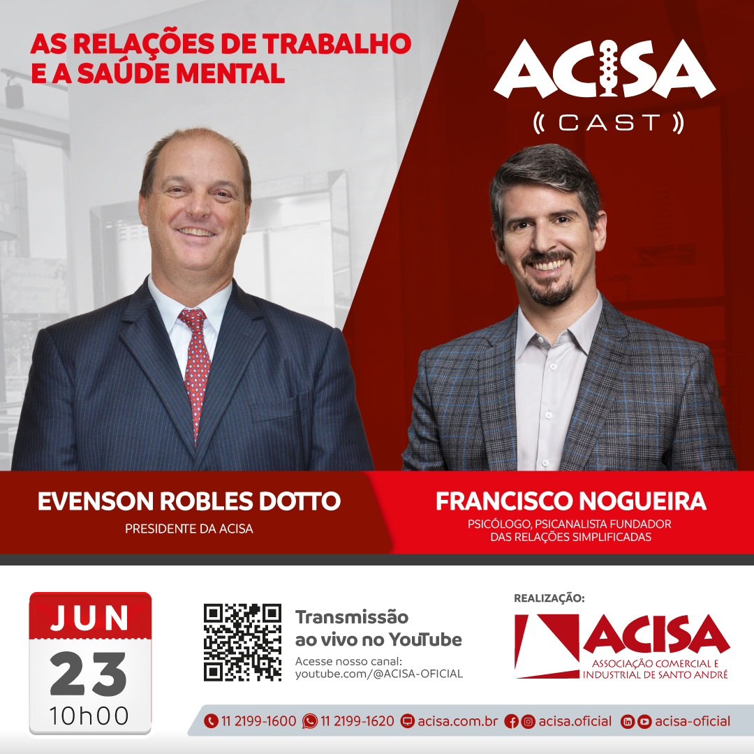 Para debater essa questão tão relevante no contexto empresarial atual, a ACISA promoverá um podcast com a participação de Francisco Nogueira, psicólogo e psicanalista, e do presidente da entidade, Evenson Robles Dotto.