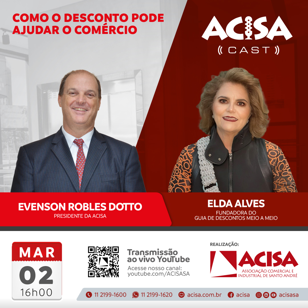 O programa será transmitido ao vivo pelo canal da ACISA no YouTube (https://www.youtube.com/user/ACISASA) na segunda-feira, 2 de março, às 16h. Na ocasião, o presidente da ACISA, Evenson Robles Dotto, recebe no estúdio Elda Alves, fundadora do guia de descontos Meio a Meio, que reúne serviços, comércio e gastronomia da região do Grande ABC.