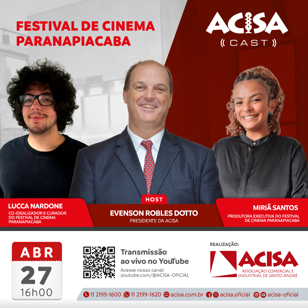 Apoio à cultura também faz parte da pauta da Associação Comercial e Industrial de Santo André – ACISA. Por isso, a próxima edição do ACISA Cast, na segunda-feira (27 de abril), às 16h, trará como tema o Festival de Cinema de Paranapiacaba. Com apresentação do presidente Evenson Robles Dotto e transmissão ao vivo pelo canal oficial da entidade no YouTube (@ACISA-OFICIAL), o podcast contará com a presença dos coordenadores do festival, Miriã Santos e Lucca Nardone.