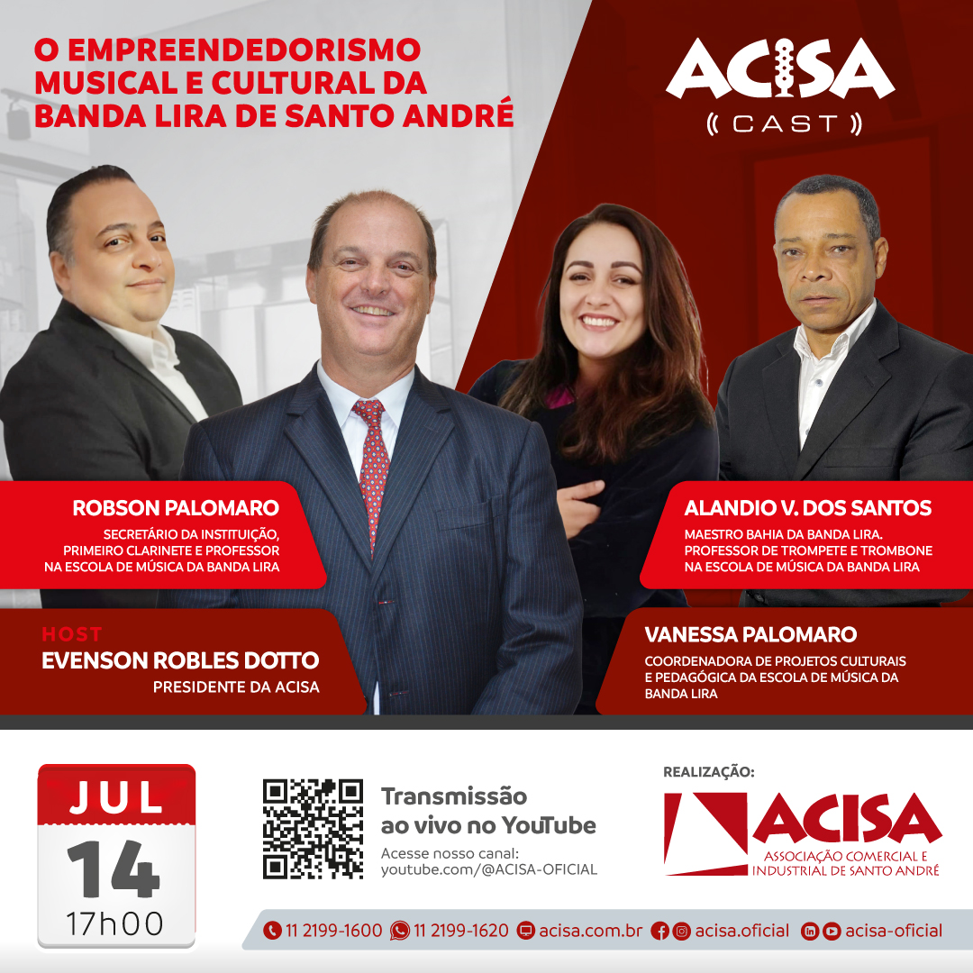 A próxima edição do ACISA Cast, apresentará aos internautas a história da Banda Lira de Santo André, que em 2025 completou 107 anos de fundação e considerada um dos patrimônios culturais mais antigos da cidade. A transmissão será ao vivo, na segunda-feira (14 de julho), às 17h, pelo canal YouTube.com/@ACISA-OFICIAL.
