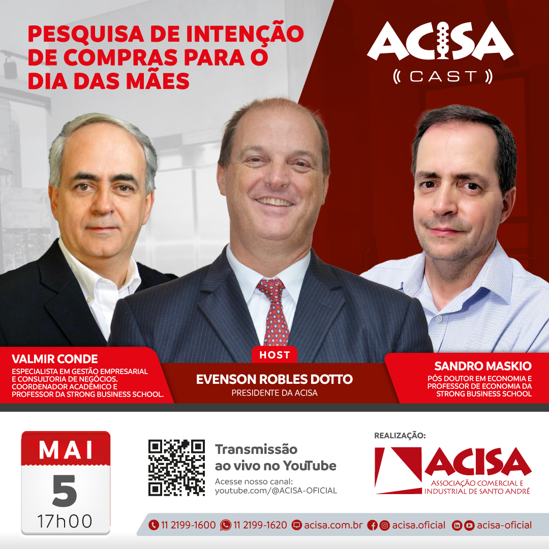 Para apresentar os resultados da pesquisa voltada para o Dia das Mães, a ACISA realizará, na segunda-feira (5 de maio), às 17h, um podcast com a participação dos professores Valmir Conde e Sandro Maskio, sob a mediação do presidente da entidade, Evenson Robles Dotto. A transmissão será ao vivo pelo canal do YouTube: youtube.com/@ACISA-OFICIAL.