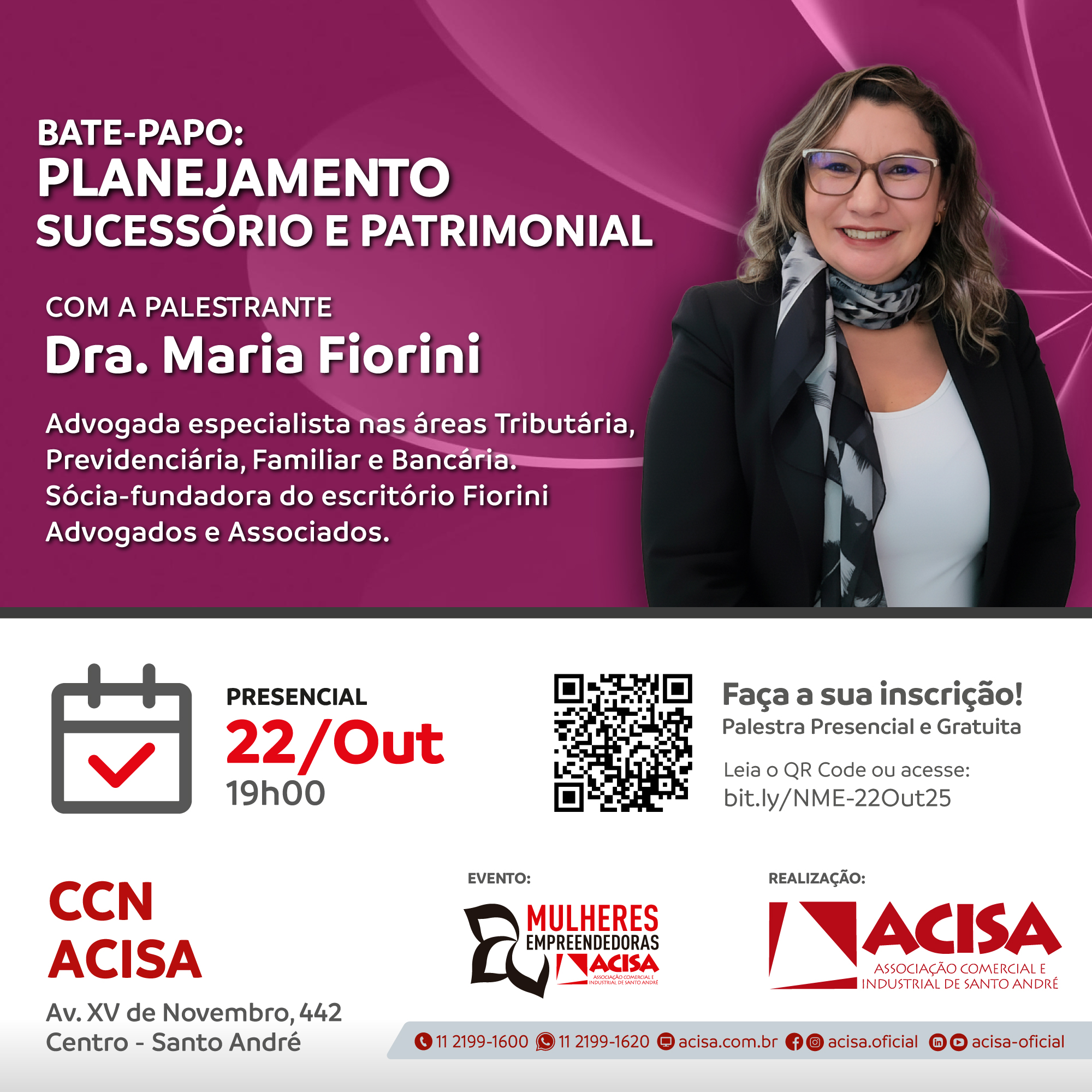 Na quarta-feira (22 de outubro), às 19h, o Núcleo de Mulheres Empreendedoras (NME) da Associação Comercial e Industrial de Santo André (ACISA) realizará um bate-papo sobre planejamento sucessório, patrimonial e gestão de risco, no Centro de Capacitação e Negócios da entidade.