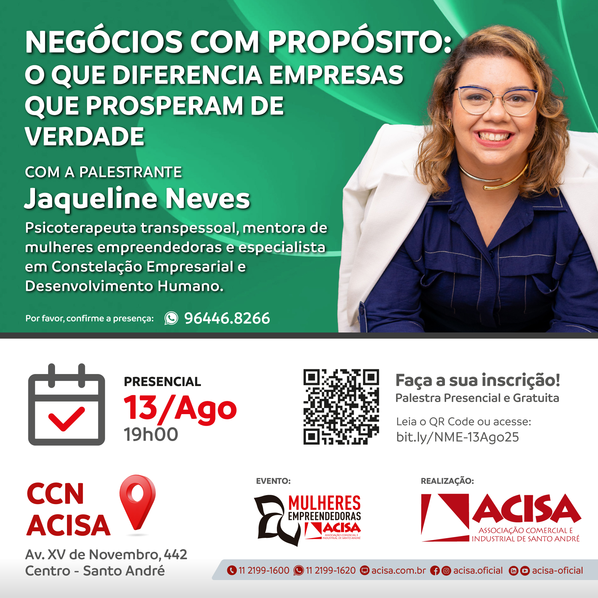 O evento acontecerá na quarta-feira (13 de agosto), às 19h, no Centro de Capacitação & Negócios ACISA e será comandado por Jaqueline Neves, psicoterapeuta transpessoal, mentora de mulheres empreendedoras e especialista em Constelação Empresarial e Desenvolvimento Humano. A profissional é formada em Ciências Contábeis, pós-graduada em Psicologia Transpessoal, possui mais de 15 anos de experiência no mercado corporativo e é fundadora da Attendy Consultoria, conduzindo processos de reconexão entre líderes, equipes e resultados.