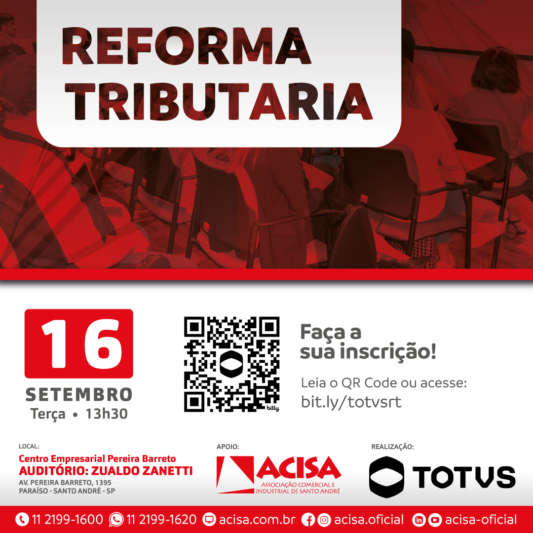 A ACISA, em parceria com a TOTVS, promove um encontro exclusivo e gratuito para empresários e gestores sobre os impactos da Reforma Tributária no ambiente empresarial.