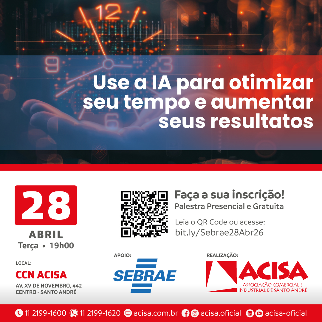No dia 28 de abril (terça-feira), às 19h, no Centro de Capacitação & Negócios da ACISA, será realizada a palestra Use a IA para otimizar tempo e aumentar seus resultados. Para participar, os interessados deverão fazer gratuitamente a sua inscrição por meio do link: https://bit.ly/Sebrae28Abr26